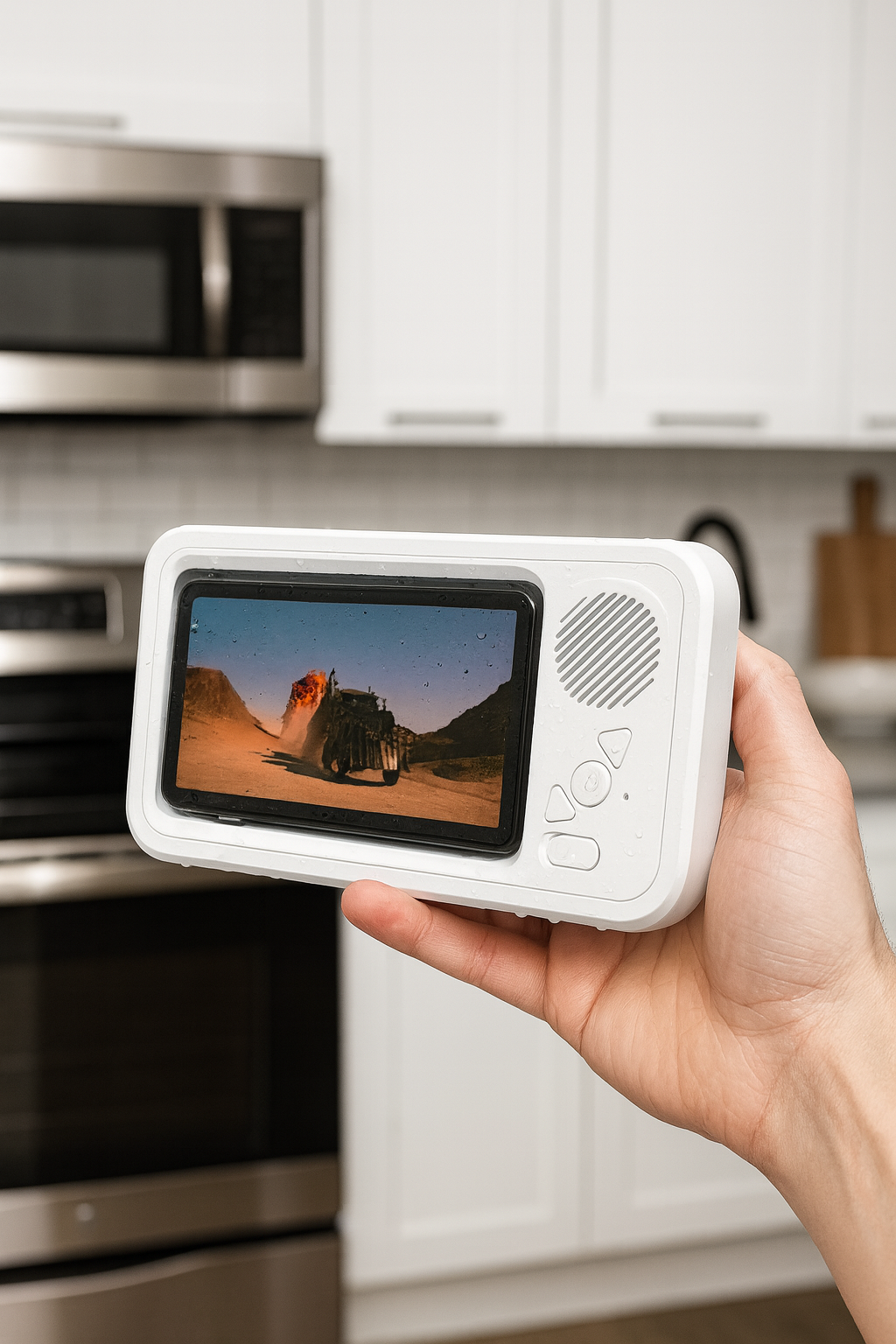 The waterproof, anti-fog design keeps your screen clear and your sound loud — even in wet environments like the shower, bath, or kitchen.