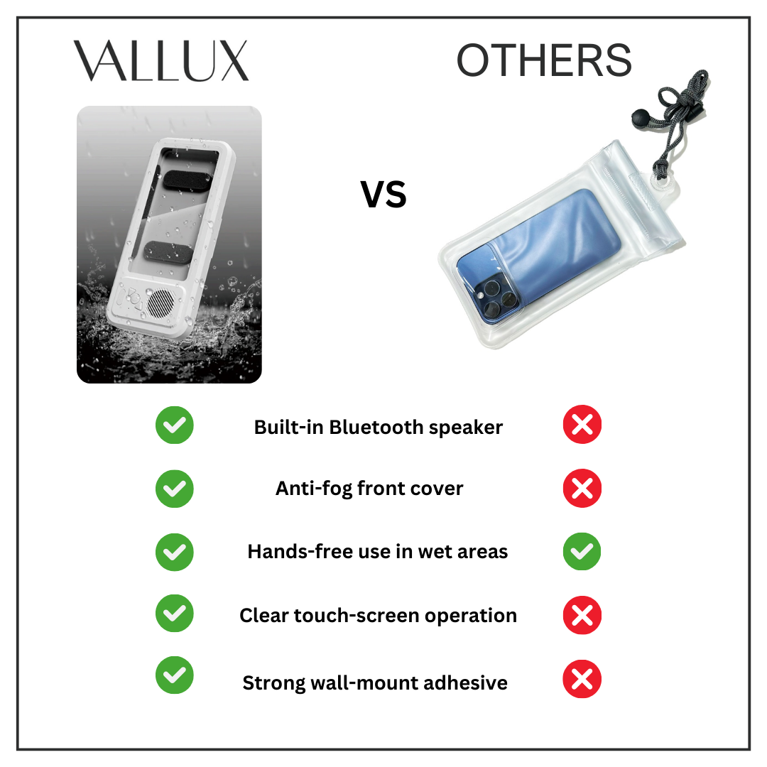 Turn everyday moments into immersive sound experiences. With your Vallux™ HydroTone Case with built-in Bluetooth speaker, you can enjoy clear, powerful audio while keeping your phone safe and hands-free. Whether you’re showering, cooking, or relaxing, it transforms ordinary routines into entertainment-filled moments—no stress, no splashes, just great sound.